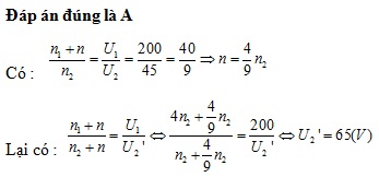 Một máy biến áp lý tưởng có số vòng dây của cuôn sơ cấp và của cuộn thứ cấp lần lượt là n1 và n2, với n1 = 4n2. Nếu quấn thêm cùng chiều quấn ban đầu vào cuộn sơ cấp n vòng dây rồi đặt vào hai đầu cuôn sơ cấp điện áp xoay chiều có giá trị hiệu dụng 200V thì điện áp ở hai đầu cuộn thứ cấp để hở là là 45 V. Khi cuộn sơ cấp đã có n1+n vòng dây, quấn thêm vào cuộn thứ cấp n vòng dây theo cùng chiều vòng ban đầu (giữ nguyên điện áp đặt vào cuộn sơ cấp) thì điện áp hiêu dụng ở hai đầu cuộn thứ cấp để hở là.