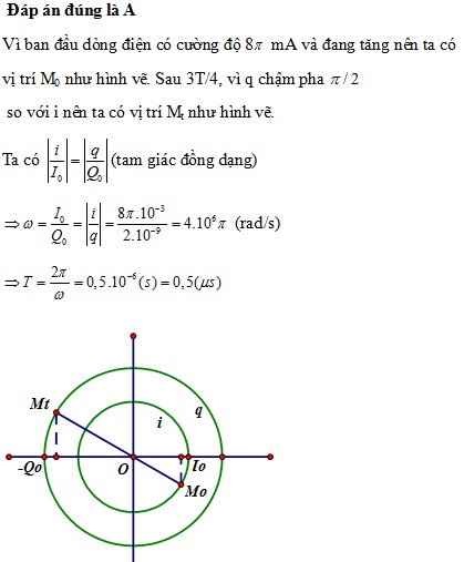 Mạch dao động LC đang thực hiện dao động điện từ tự do với chu kỳ T. Tại thời điểm nào đó dòng điện trong mạch có cường độ 8π(mA) và đang tăng, sau đó khoảng thời gian 3T /4 thì điện tích trên bản tụ có độ lớn 2.10-9C.Chu kỳ dao động điện từ của mạch bằng