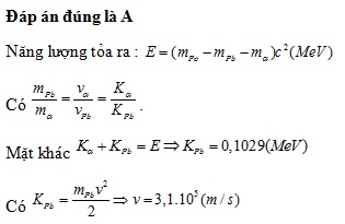Chất phóng xạ 21084Po phát ra tia α và biến đổi thành 20682Pb. Biết khối lượng các hạt là mPb = 205,9744u, mPo = 209,9828u, mα= 4,0026u. Giả sử hạt nhân mẹ ban đầu đứng yên và sự phân rã không phát ra tia γ thì tốc độ của hạt nhân con là: (1u.c2=931,5Mev)