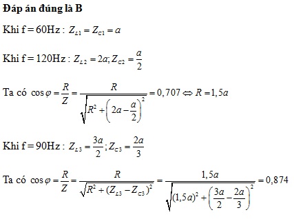 Mắc vào đoạn mạch RLC không phân nhánh một nguồn điện xoay chiều có tần số thay đổi được. Ở tần số f1 =60Hz, hệ số công suất đạt cực đại cosφ=1. Ở tần số f2 =120Hz , hệ số công suất nhận giá trị cosφ=0,707 . Ở tần số f3 =90Hz , hệ số công suất của mạch bằng