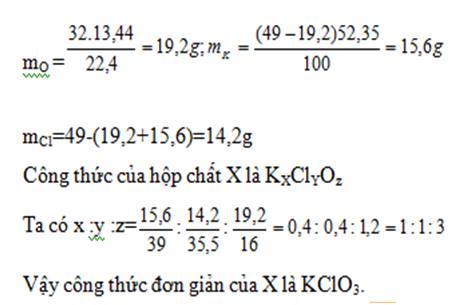 Khi nhiệt phân 49g hợp chất X1 thu được 13,44 lít(đktc) khí O2 và bã rắn chứa 52,35% kali và 47,65% clo.Xác định công thức hợp chất X ?