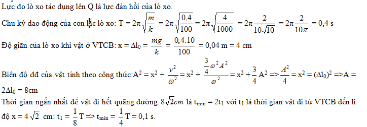 Một con lắc lò xo treo thẳng đứng dao động điều hòa, lò xo có độ cứng 100N/m, vật nặng có khối lượng 400 g. Mốc thế năng tại vị trí cân bằng, lấy g = 10 m/s2 và π2 = 10 . Gọi Q là đầu cố định của lò xo. Khi lực tác dụng của lò xo lên Q bằng 0, tốc độ của vật