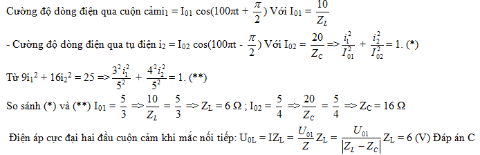 Đặt nguồn điện xoay chiều u1 = 10cos(100πt)V vào hai đầu cuộn cảm thuần L thì cường độ dòng điện tức thời chạy qua cuộn cảm là i1. Đặt nguồn điện xoay chiều u2 = 20sin(100πt)V vào hai đầu tụ điện C thì cường độ dòng điện tức thời chạy qua tụ điện là i2. Mối quan hệ về giá trị tức thời giữa cường độ dòng điện qua hai mạch trên là 9i12 +16i22 = 25(mA)2. Khi mắc cuộn cảm nối tiếp với tụ điện rồi mắc vào nguồn điện xoay chiều u1 thì điện áp cực đại trên cuộn cảm thuần là