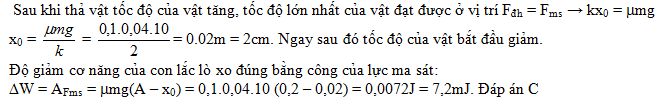 Một con lắc lò xo đặt trên mặt phẳng nằm ngang gồm lò xo nhẹ có độ cứng 2 N/m và vật nhỏ khối lượng 40 g. Hệ số ma sát trượt giữa vật và mặt phẳng ngang là 0,1. Ban đầu giữ vật ở vị trí lò xo bị giãn 20 cm rồi buông nhẹ để con lắc dao động tắt dần. Lấy g = 10 m/s2. Kể từ lúc đầu cho đến thời điểm tốc độ của vật bắt đầu giảm, cơ năng của con lắc lò xo đã giảm một lượng bằng