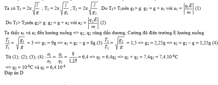 Có ba con lắc cùng chiều dài dây treo, cùng khối lượng. Con lắc thứ nhất và thứ hai mang điện tích q1 và q2, con lắc thứ ba không mang điện tích. Chu kì dao động điều hoà của chúng trong điện trường có phương thẳng đứng lần lượt là T1, T2 và T3 với T3 = 3T1; 3T2 = 2T3. Tính q1 và q2.