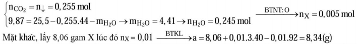 Đốt cháy hoàn toàn 4,03 gam triglixerit X bằng một lượng oxi vừa đủ, cho toàn bộ sản phẩm cháy hấp thụ hết vào bình đựng nước vôi trong dư thu được 25,5 gam kết tủa và khối lượng dung dịch thu được giảm 9,87 gam só với khối lượng nước vôi trong ban đầu. Mặt khác, khi thủy phân hoàn toàn 8,06 gam X trong dụng dịch NaOH (dư) đun nóng, thu được dung dịch chưa a gam muối. Giá trị của a là