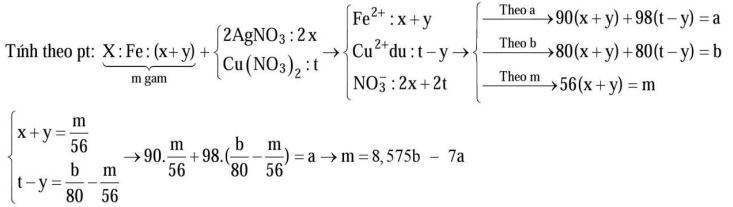 Cho m gam bột sắt vào dung dịch X chưa AgNO3 và Cu(NO3)2 đến khi các phản ứng kết thúc thu được chất rắn Y và dung dịch Z. Cho dung dịch Z tác dụng hết với dung dịch NaOH dư, thu được a gam kết tủa T gồm hai hidroxit kim loại. Nung T đến khối lượng không đổi thu được b gam chất rắn. Biểu thức liên hệ giữa m, a, b có thể là