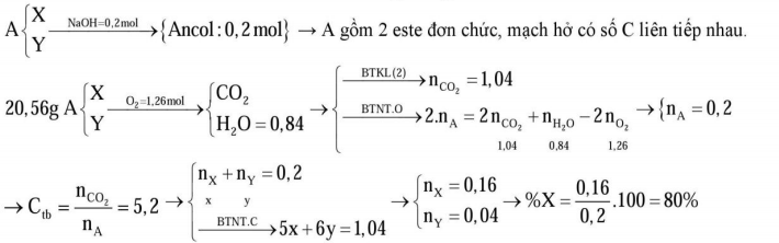 Cho hỗn hợp A gồm hai chất hữu cơ mạch hở X, Y (chỉ chứa C, H, O mà MX < MY) tác dụng vừa đủ với 200 ml dung dịch NaOH 1M, thu được 0,2 mol một ancol đơn chức và 2 muối của hai axit hữu cơ đơn chức, kế tiếp nhau trong dãy đồng đẳng. Mặt khác đốt cháy 20,56 gam A cần 1,26 mol O2 thu được CO2 và 0,84 mol H2O. Phần trăm số mol của X trong A là