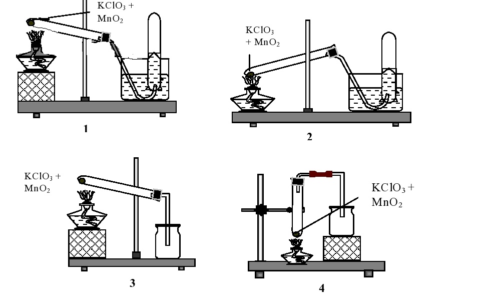 Trong phòng thí nghiệm khí oxi có thể được điều chế bằng cách nhiệt phân muối KClO3 có MnO2 làm xúc tác và có thể được thu bằng cách đẩy nước hay đẩy không khí.Trong các hình vẽ cho dưới đây, hinh vẽ nào mô tả điều chế oxi đúng cách: