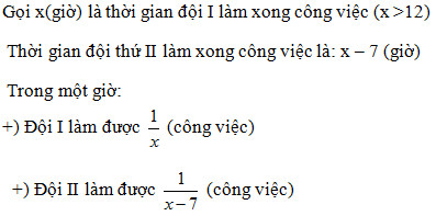 Hai đội công nhân cùng làm chung một công việc thì hoàn thành sau 12 giờ, nếu làm riêng thì thời gian hoàn thành công việc của đội thứ hai ít hơn đội thứ nhất là 7 giờ. Hỏi nếu làm riêng thì thời gian để mỗi đội hoàn thành công việc là bao nhiêu?