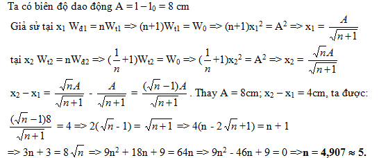 Một con lắc lò xo gồm lò xo có chiều dài tự nhiên l0 = 30 cm. Kích thích cho con lắc dao động điều hòa theo phương nằm ngang thì chiều dài cực đại của lò xo là 38 cm. Khoảng cách ngắn nhất giữa hai thời điểm động năng bằng n lần thế năng và thế năng bằng n lần động năng là 4 cm. Giá trị lớn nhất của n gần với giá trị nào nhất sau đây?