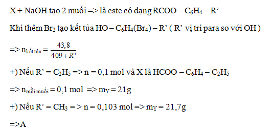 Este X có công thức phân tử là C9H8O2 tác dụng với một lượng tối đa dung dịch NaOH đun nóng thu được dung dịch Y chỉ chứa hai muối. Thêm Br2 dư vào dung dịch Y (sau khi đã được axit hoá bằng HCl loãng dư) thu được 43,8 gam kết tủa chứa 4 nguyên tử brom trong phân tử. Tổng khối lượng muối trong Y là