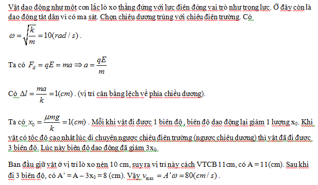 Một con lắc lò xogồm lò xo nhẹ có độ cứng 10 N/m và vật nhỏ khối lượng m = 100 g được đặt trên giá đỡ cố định nằm ngang dọc theo trục lò xo, hệ số ma sát trượt giữa giá đỡ và vật nhỏ là 0,1. Vật được tích điện q = +2.10-6C. Con lắc được đặt trong điện trường đều nằm ngang có chiều trùng chiều dãn lò xo, có độ lớn E = 5.104 V/m. Ban đầu giữ vật ở vị trí lò xo bị nén 10cm rồi buông nhẹ để con lắc dao động. Lấy g = 10 m/s2. Tốc độ lớn nhất vật nhỏ đạt được khi dao động ngược chiều điện trường là