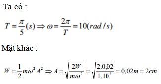 Một vật khối lượng 1 kg dao động điều hòa với chu kì T = π/5 s, năng lượng của vật là 0,02 J. Biên độ dao động của vật là