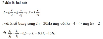 Một sợi dây đàn hồi AB hai đầu cố định được kích thích dao động với tần số 20 Hz thì trên dây có sóng dừng ổn định với 4 bụng sóng. Để trên dây có sóng dừng với 2 bụng sóng thì tần số dao động của sợi dây là