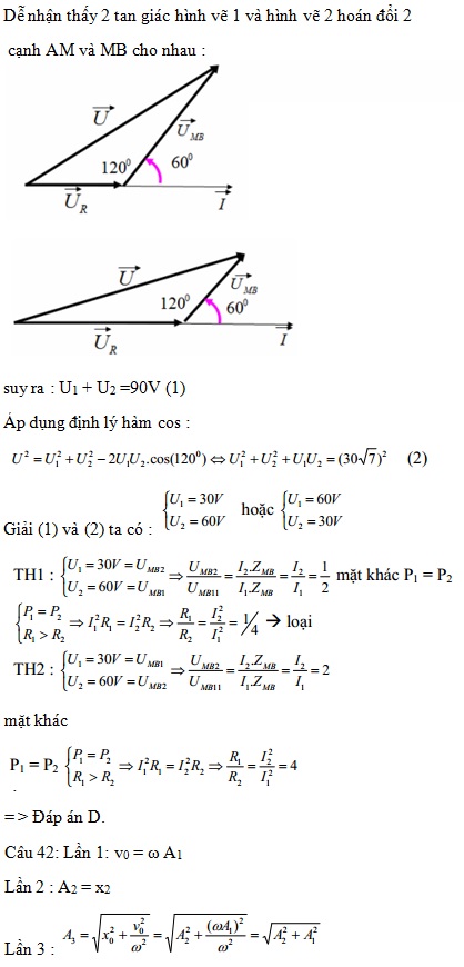 cosωt (V) với ω không đổi. Điện áp tức thời hai đầu đoạn mạch MB lệch pha π/3 so với dòng điện trong mạch. Khi giá trị biến trở R = R1 thì công suất tiêu thụ trên biến trở là P và điện áp hiệu dụng hai đầu đoạn mạch MB là U1. Khi giá trị biến trở R = R2 (R2 < R1 ) thì công suất tiêu thụ trên biến trở vẫn là P và điện áp hiệu dụng hai đầu đoạn mạch MB là U2. Biết rằng U1 + U2 = 90V. Tỷ số giữa R1 và R2 là