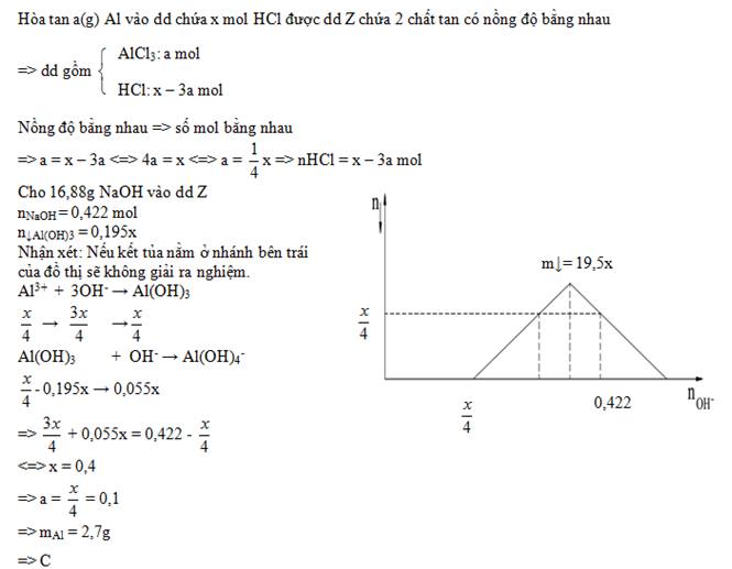 Cho a gam Al tan hoàn toàn vào dung dịch chứa x mol HCl thu được dung dịch Z chứa 2 chất tan có cùng nồng độ mol. Thêm từ từ dung dịch chứa 16,88 gam NaOH vào dung dịch Z thì kết tủa thu được là 15,21x gam. Giá trị của a gần nhất với: