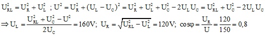 t V. Biết điện áp hiệu dụng hai đầu cuộn dây là URL = 200 V và hai đầu tụ điện là UC = 250 V. Hệ số công suất của mạch là