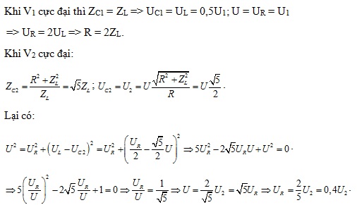 Cho mạch điện như hình vẽ. C là tụ xoay còn L là cuộn dây thuần cảm. Điện áp giữa hai đầu đoạn mạch có giá trị hiệu dụng và tần số không đổi, V1 và V2 là các vôn kế lí tưởng. Điều chỉnh giá trị của C để số chỉ của V1 cực đại là U1, khi đó số chỉ của V2 là 0,5U1. Khi số chỉ của V2 cực đại là U2, thì số chỉ củaV1 lúc đó là