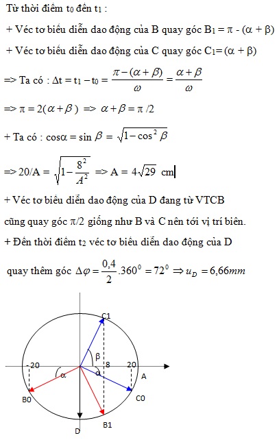 Một sóng cơ lan truyền trên sợi dây từ C đến B với chu kì T = 2 s, biên độ không đổi. Ở thời điểm t0, ly độ các phần tử tại B và C tương ứng là - 20 mm và + 20 mm; các phần tử tại trung điểm D của BC đang ở vị trí cân bằng. Ở thời điểm t1, li độ các phần tử tại B và C cùng là +8 mm. Tại thời điểm t2 = t1 + 0,4 s li độ của phần tử D có li độ gần nhất với giá trị nào sau đây?