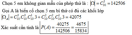 Trường trung học phổ thông Việt Trì có 30 lớp trong đó có 10 lớp 10, 10 lớp 11và 10 lớp 12, mỗi chi đoàn (lớp) có một em làm bí thư. Ban chấp hành Đoàn trường muốn chọn 5 em bí thư đi thi cán bộ đoàn giỏi. Tìm xác suất để 5 em được chọn có đủ cả ba khối lớp.