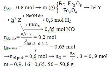 Trộn 21,6 gam bột Al với m gam hỗn hợp X gồm FeO, Fe2O3, Fe3O4 thu được hỗn hợp Y. Nung Y ở nhiệt độ cao trong điều kiện không có không khí đến phản ứng xảy ra hoàn toàn, thu được chất rắn Z. Cho Z tác dụng với dung dịch NaOH dư thu được 6,72 lít H2 (đktc). Mặt khác, nếu cho Z tác dụng với dung dịch HNO3 loãng dư thu được 19,04 lít NO (sản phẩm khử duy nhất, ở đktc). Giá trị của m là