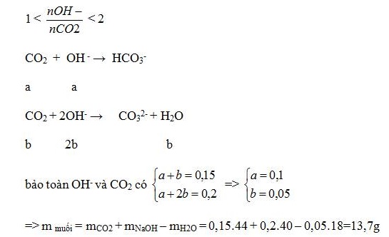 Sục 3,36 lít khí CO2 (đktc) vào 200 ml dung dịch NaOH 1M. Tổng khối lượng muối thu được sau phản ứng là