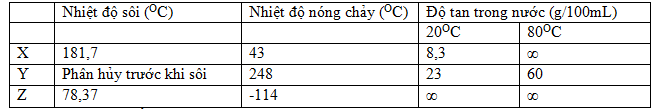 Nhiệt độ nóng chảy, nhiệt độ sôi và độ tan trong nước của ba chất hữu cơ X, Y, Z được trình bày trong bảng sau: