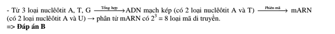 Chỉ có 3 loại nuclêôtit A, T, G người ta đã tổng hợp nên một phân tử ADN nhân tạo, sau đó sử dụng phân tử ADN này làm khuôn để tổng hợp một phân tử mARN. Phân tử mARN này có tối đa bao nhiêu loại mã di truyền?