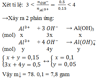 Trộn 500 ml dung dịch NaOH 1M với 500 ml dung dịch AlCl3 0,3M đến phản ứng hoàn toàn thu được m g kết tủa. Giá trị của m là?