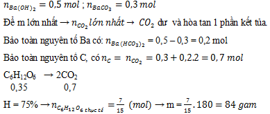 Lên men m gam glucozơ để điều chế ancol etylic (hiệu suất lên men 75%). Toàn bộ khí sinh ra được hấp thụ vào 500ml dung dịch Ba(OH)2 1M, kết thúc phản ứng thu được 59,1gam kết tủa. Giá trị lớn nhất của m thỏa mãn điều kiện bài toán là