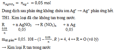 Cho 1 gam kim loại R vào 200ml dung dịch AgNO3 0,25M đến khi phản ứng hoàn toàn thu được dung dịch không chứa ion Ag+ và có khối lượng giảm so với khối lượng của dung dịch AgNO3 ban đầu là 4,4 gam. Kim loại R là?