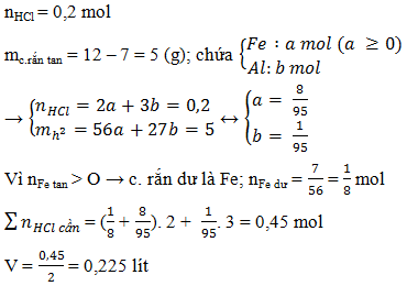 Cho 12 gam hỗn hợp X gồm Al và Fe vào 100ml dung dịch HCl 2M đến phản ứng hoàn toàn thu được khí H2 và 7,0 gam chất rắn chưa tan. Thể tích dung dịch HCl 2M tối thiểu cần dung để hòa tan hết 12 gam hỗn hợp X là?