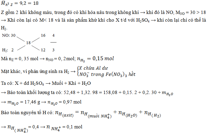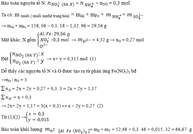 Nung m gam hỗn hợp gồm Al và Fe(NO3)3 trong điều kiện không có không khí, sau một thời gian thu được 52,48 gam chất rắn X và 7,056 lít hỗn hợp khí Y (đktc) gồm NO2 và O2. Hòa tan hoàn toàn X trong 1,32 lít dung dịch H2SO4 1M thu được dung dịch Y chỉ chứa 158,08 gam chất rắn là các muối sunfat trung hòa và 7,84 lít hỗn hợp khí Z gồm hai khí không màu, có một khí hóa nâu ngoài không khí, tỉ khối của Z so với H2 là 9. Giá trị m gần nhất với giá trị nào sau đây?