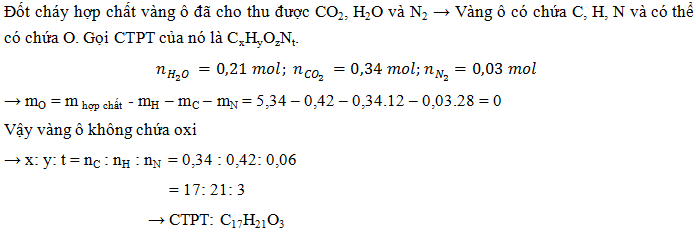 Theo cơ quan nghiên cứu ung thư quốc tế WHO (IARC), chất vàng ô (Auramine O) là chất đứng hành thứ 5 trong 116 chất gây ung thư hàng đầu trên thế giới. Trong thời gian vừa qua, cơ quan chức năng đã phát hiện hàng loạt các vụ việc sử dụng chất vàng ô để nhuộm vàng măng tươi, dưa muối, cho vào thức ăn chăn nuôi để tạo màu da vàng hấp dẫn của gia cầm… Đốt cháy hoàn toàn 5,34 gam chất vàng ô bằng oxi thu được khí CO2, hơi nước và khí N2. Dẫn sản phẩm cháy lần lượt qua bình (1) đựng H2SO4 đặc, bình (2) đựng dung dịch Ba(OH)2 dư, thấy khối lượng bình (1) tăng 3,78 gam, bình (2) thu được 66,98 gam kết tủa và có 0,672 lít khí N2 (đktc) thoát ra. Công thức phân tử của chất vàng ô là