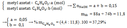 Cho 11,8 gam hỗn hợp gồm metyl axetat và etyl axetat tác dụng vừa đủ với 150 gam dung dịch NaOH 4%. Phần trăm khối lượng của etyl axetat trong hỗn hợp bằng