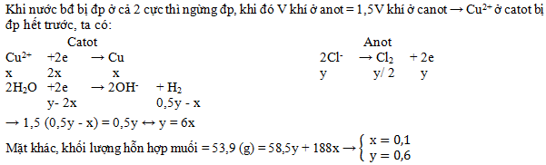 Điện phân dung dịch chứa 53,9 gam hỗn hợp muối NaCl và Cu(NO3)2 với điện cực trơ, màng ngăn xốp, đến khi nước điện phân ở cả hai điện cực thì ngừng điện phân, tại thời điểm này thể tích khí sinh ở anot gấp 1,5 lần thế tích khí thoát ra ở catot ở cùng điều kiện nhiệt độ và áp suất. Nhận xét nào sau đây không đúng?
