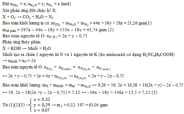 Hỗn hợp X gồm các peptit mạch hở, đều được tạo thành từ các aminoaxit có dạng H2NCaHbCOOH. Đun nóng 9,26 gam X với dung dịch KOH dư, thu được dung dịch chứa 16,38 gam muối. Nếu đôt cháy hoàn toàn 9,26 gam X cần 8,4 lít O2 (đktc). Dẫn toàn bộ sản phẩm cháy (CO2, H2O, N2) vào dung dịch Ba(OH)2 dư, sau phản ứng thu được m gam kết tủa và khối lượng dung dịch giảm 43,74 gam. Giá trị của m gần nhất với giá trị nào sau đây?