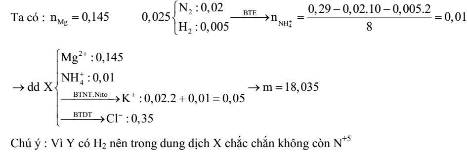 Cho 3,48 gam bột Mg tan hết trong dung dịch hỗn hợp gồm HCl (dư) và KNO3, thu được dung dịch X chứa m gam muối và 0,56 L (đktc) hỗn hợp khí Y gồm N2 và H2. Khí Y có tỉ khối so với H2 bằng 11,4. Giá trị của m là