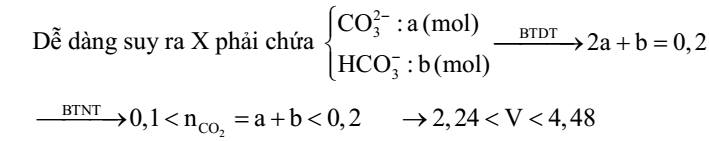 Hấp thụ V lít CO2 (đktc) vào 200 mL dung dịch NaOH 1M thu được dung dịch X. Khi cho BaCl2 dư vào dung dịch X được kết tủa và dung dịch Y, đun nóng Y lại thấy có kết tủa xuất hiện. Khoảng giá trị của V là