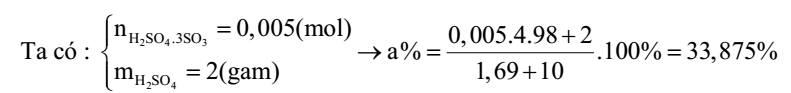 Hòa tan hết 1,69 gam oleum có công thức H2SO4.3SO3 vào 10g dung dịch H2SO4 20% được dung dịch X có nồng độ a%. Giá trị của a là