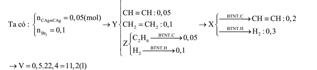 Dẫn V lít (đktc) hỗn hợp X gồm axetilen và hiđro đi qua ống sứ đựng bột niken nung nóng, thu được khí Y. Dẫn Y vào lượng dư AgNO3 trong dung dịch NH3 thu được 12 gam kết tủa. Khí đi ra khỏi dung dịch phản ứng vừa đủ với 16 gam brom và còn lại khí Z. Đốt cháy hoàn toàn khí Z được 2,24 lít khí CO2 (đktc) và 4,5 gam H2O. Giá trị của V bằng