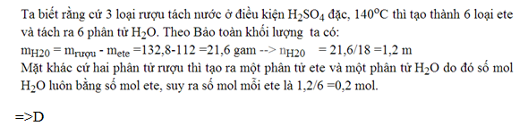 Đun 132,8 gam hỗn hợp 3 ancol no, đơn chức với H2SO4 đặc ở 140oC thu được hỗn hợp các ete có số mol bằng nhau và có khối lượng là 111,2 gam. Số mol của mỗi ete trong hỗn hợp là bao nhiêu?
