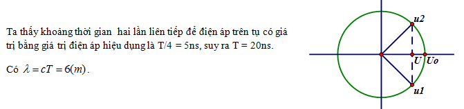 Mạch chọn sóng của máy thu gồm một tụ điện và một cuộn cảm. Khi thu được sóng điện từ có bước sóng λ, người ta nhận thấy trong khoảng thời gian hai lần liên tiếp điện áp trên tụ có giá trị bằng giá trị điện áp hiệu dụng là 5ns. Biết tốc độ sóng điện từ là 3.108m/s. Bước sóng λ là: