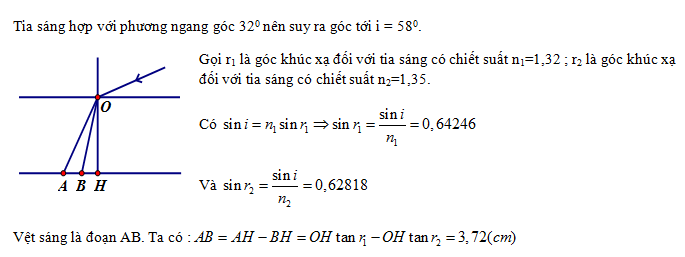 Một tia sáng mặt trời chiếu nghiêng hợp với phương ngang một góc 320 tới mặt nước trong bể sâu 1,2m. Chiết suất của nước đối với ánh sáng trắng bằng n (1,32<n<1,35). Độ dài vệt sáng tạo trên mặt đáy bể nằm ngang bằng: