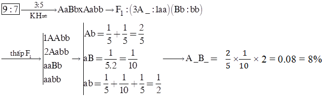 Ở một loài thực vật, chiều cao của thân do hai cặp gen A, a và B, b phân li độc lập quy định; khi kiểu gen có cả hai alen A và alen B quy định kiểu hình thân cao; các kiểu gen còn lại quy định thân thấp. Cho hai cây có kiểu hình khác nhau (P) giao phấn với nhau, thu được F1 có kiểu hình phân li theo tỉ lệ 3 cây thân cao: 5 cây thân thấp. Cho tất cả các cây thân thấp ở F1 tạp giao với nhau thì ở đời sau thu được cây thân cao chiếm tỉ lệ là