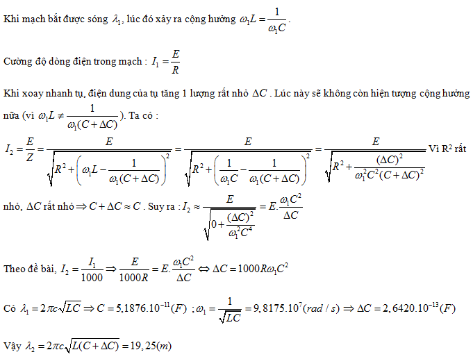 Mạch chọn sóng của máy thu vô tuyến gồm một cuộn dây có độ tự cảm 2μH và một tụ xoay. Điện trở thuần của mạch là 1mΩ. Sau khi bắt được sóng điện từ có bước sóng 19,2m thì xoay nhanh tụ tăng điện dung để suất điện động không đổi nhưng cường độ hiệu dụng dòng điện thì giảm xuống 1000 lần. Xác định bước sóng mà mạch có thể bắt được lúc này: