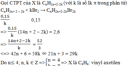 Hidrocacbon X ở thể khí trong điều kiện thường. Cho X lội từ từ qua dung dịch Br2 dư thấy khối lượng bình đựng dung dịch Br2 tăng 2,6 gam và có 0,15 mol Br2 phản ứng. Tên gọi của X là ?