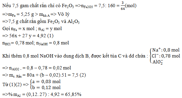 Hòa tan hoàn toàn 4,92 gam hỗn hợp A gồm (Al, Fe) trong 390 ml dung dịch HCl 2M thu được dung dịch B. Thêm 800 ml dung dịch NaOH 1M vào dung dịch B thu được kết tủa C, lọc kết tủa C, rửa sạch sấy khô nung trong không khí đến khối lượng không đổi, thu được 7,5 gam chất rắn. Phần trăm khối lượng của Al trong hỗn hợp A có giá trị gần nhất với giá trị nào sau đây ?