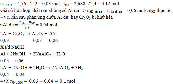 Thực hiện các phản ứng nhiệt nhôm hỗn hợp gồm m gam Al và 4,56 gam Cr2O3 (trong điều kiện không có O2), sau khi phản ứng kết thúc, thu được hỗn hợp X. Cho toàn bộ X vào một lượng dư dung dịch HCl (loãng, nóng), sau khi các phản ứng xảy ra hoàn toàn, thu được 2,688 lít H2 (đktc). Còn nếu cho toàn bộ X vào một lượng dư dung dịch NaOH (đặc, nóng), sau khi phản ứng kết thúc thì số mol NaOH đã phản ứng là ?